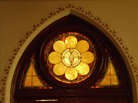Scenes from the Gospel are depicted in the stained-glass windows, which are likely original to the building.