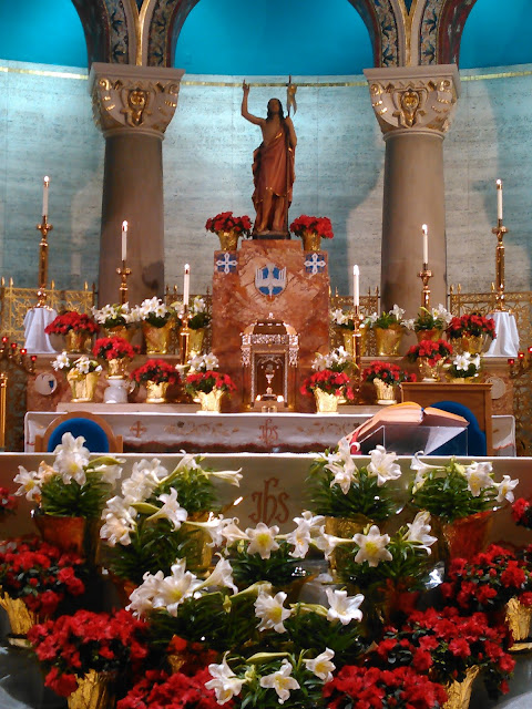 The Holy Family is depicted on the front of the ambo; St. Joseph stands on the left end of the sanctuary with the Descent of the Holy Spirit behind him.